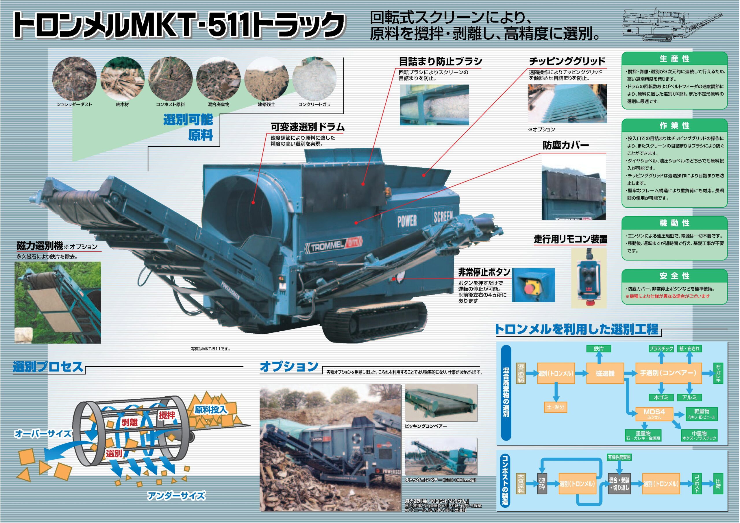 建設現場で発生する建設発生土をスパイラル方式により、攪拌、剥離、選別の3つが連動し行われ制度の高い選別を実現します。また、投入口での目詰まり防止用ブラシも装備